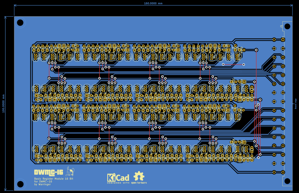 I think this is a nice initial layout for the 16 bit Register Module on an Eurocard PCB. And it would have been a nightmare to set up without the Replicate Layouts Plugin for KiCAD.