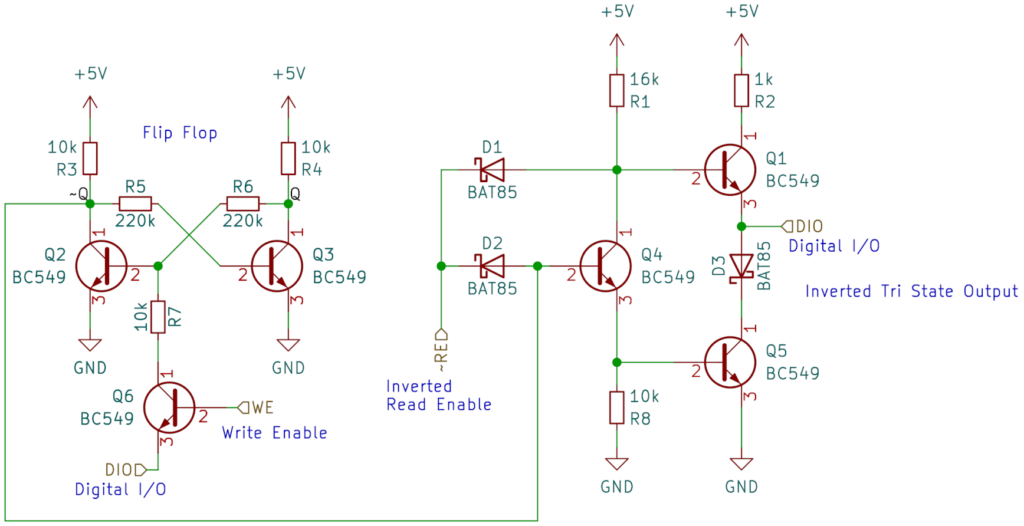 The Flip Flop itself is more or less just a simple bog standard bistable transistor logic, which can be set and reset by Q6. The idea is pretty much taken from this Creative Engineering blog post. I have then routed the inverted output and routed it into a simple tri-state buffer that I have found on Stack Exchange.