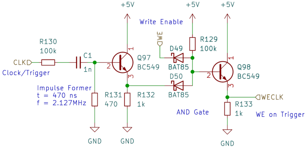 Dealing with the Write Enable Signal is a bit more complex. It needs two signals from the outside. One is a clock or trigger signal that goes through an RC differenciator circuit, buffered by a transistor, to make the Write Enable signal triggered by the positive flank of the signal. I have calculated the RC differenciator so that it for a ? of 470ns, which hopefully makes it useful at frequencies up to 2.1MHz. But I can and will change it as needed.