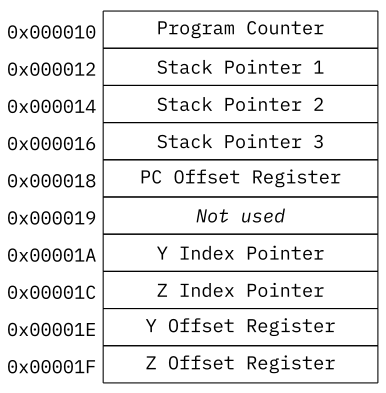 The Special Purpose Registers are a set of different registers that are used for special purposes by the CPU. Other than the General Purpose Registers, they cannot be directly accessed by the ALU or the control logic and are instead accessed via memory access in the memory area between 0x00010 and 0x0001F.