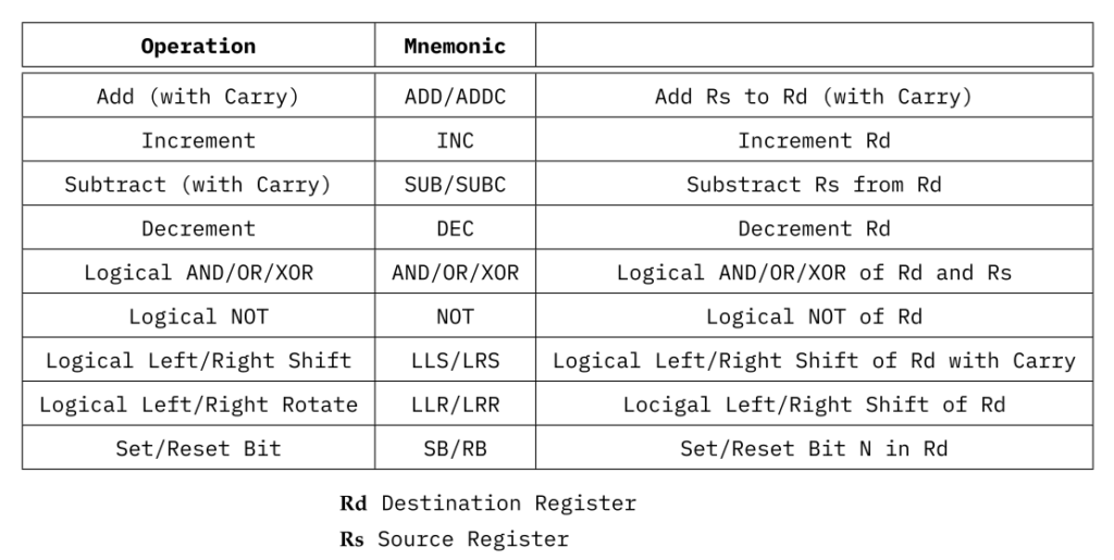 There are two types of arithmetic logical operations, those with a single operand and those with two operands. INC, DEC, NOT, LLS/LRS and LLR/LRR are operations with one operand, while AND/ANDC, SUB/SUBC, AND/OR/XOR, and SB/RB are operations with two operands. In this SB/RB are slightly different and do not use the same opcode as the other two operand operations.