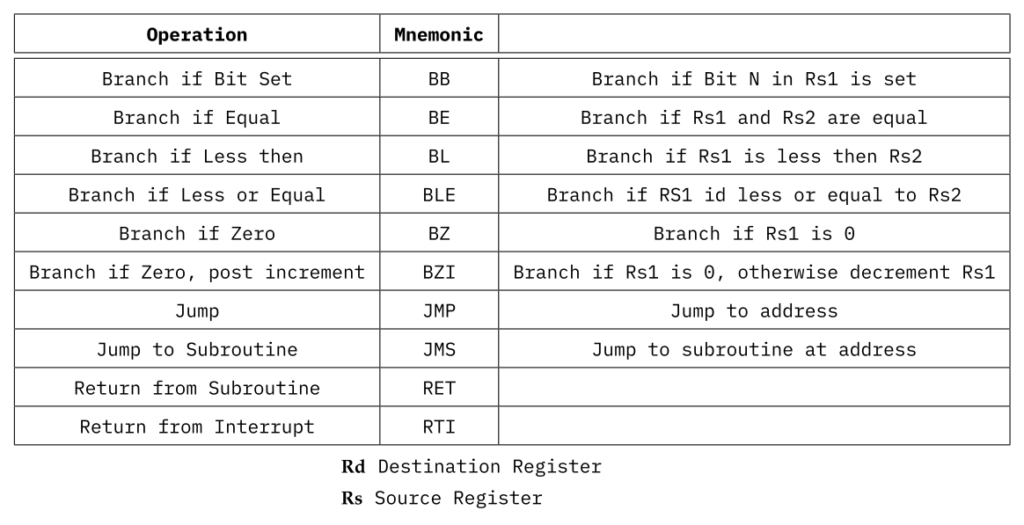 The six available branch operations are subdivided into two types, branch operations with a single operand BZ and BZI, as well as those with two operands BB, BE, BL and BLE.