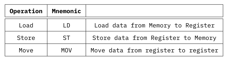 Internally, these operations are separated into two groups with LD and ST falling into the memory operations, while MOV is a register operation.