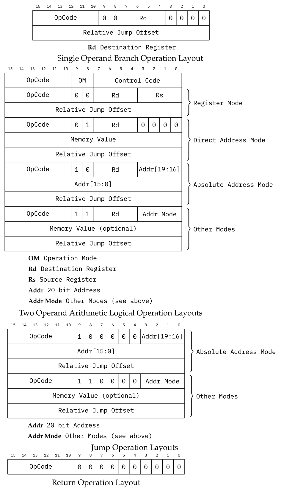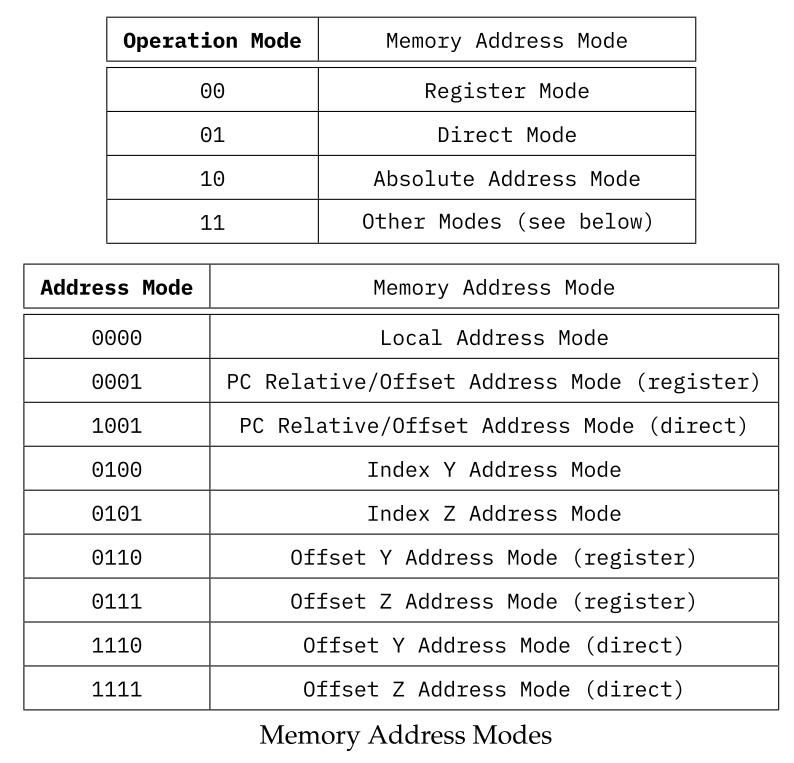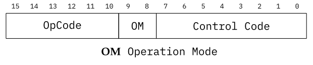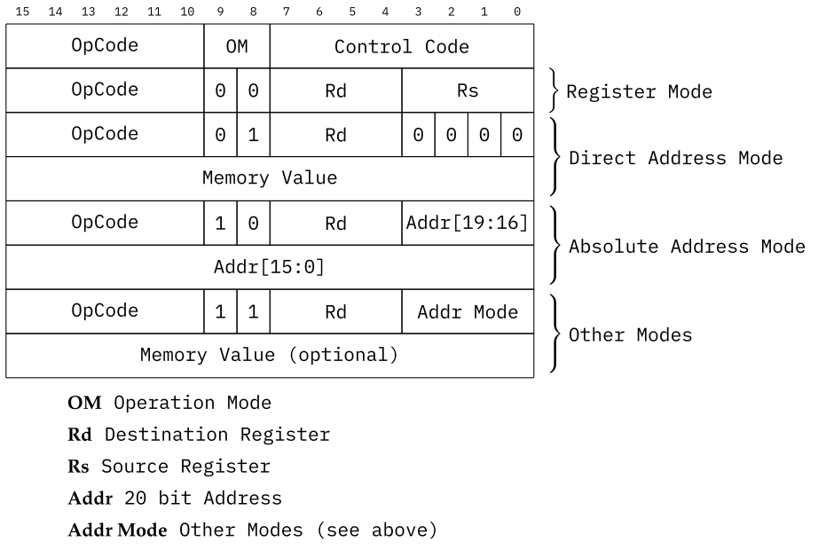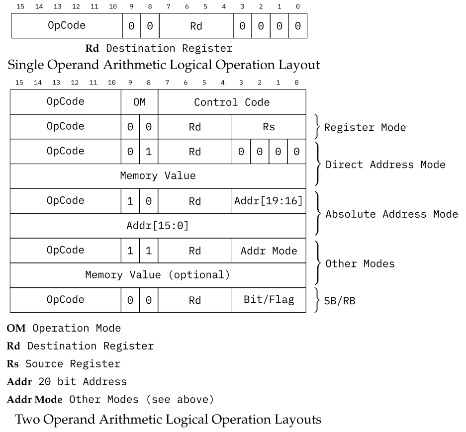 All operations share the same general OpCode Layout, consisting of a 6 bit OpCode, which allows for up to 64 different operations, followed by a 2 bit Operation Mode, which is needed to enable, for example, different memory addressing schemes, and finally an 8 bit Control Code, which in turn depends on the Operation Mode.