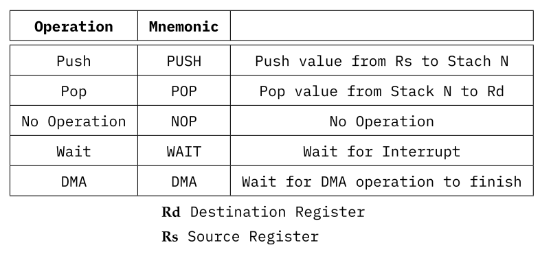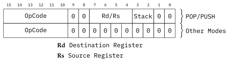 The OpCodes Layout of these operations are simplified, with six bit opcodes, the Operation Mode set to 00 and the Control Code either set to 00000000 or set to contain the Source/Destination Register and the Stack (1, 2 or 3) used to contain the data. PUSH and POP are limited to the current Register Page and are not able to save any of the Special register to the selected Stack.