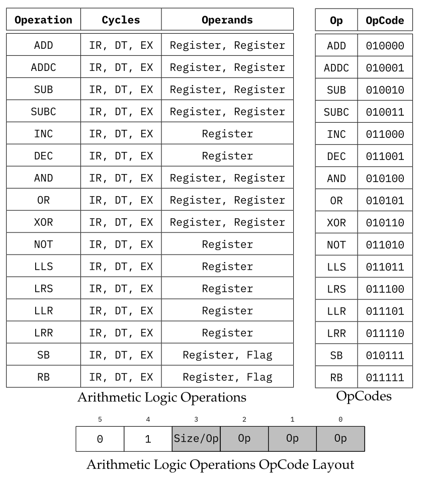 The only actually useful and needed distinction between these operations is whether or not the operation has one or two operands. Since there are seven operations with two operands and nine with only one operand, it is not an equal split, but it is workable. In this case NOT is selected to be the exception for the selection, as it only affects the Data Transfer Cycle of the operation.